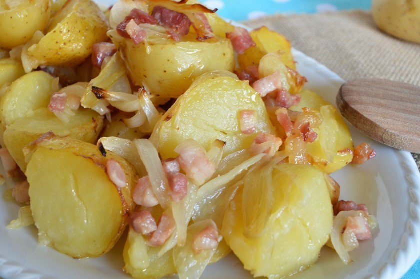 Lessare le patate, tagliarle a listarelle e saltarle in padella con cipolla e pancetta.